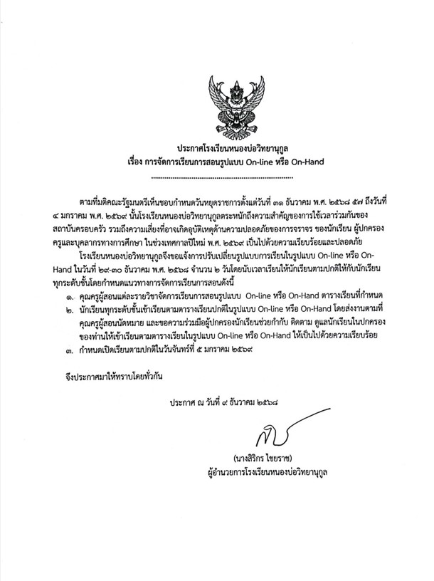 ระกาศโรงเรียนหนองบ่อวิทยานุกูล เรื่อง การจัดการเรียนการสอนรูปแบบ Online หรือ On-Hand