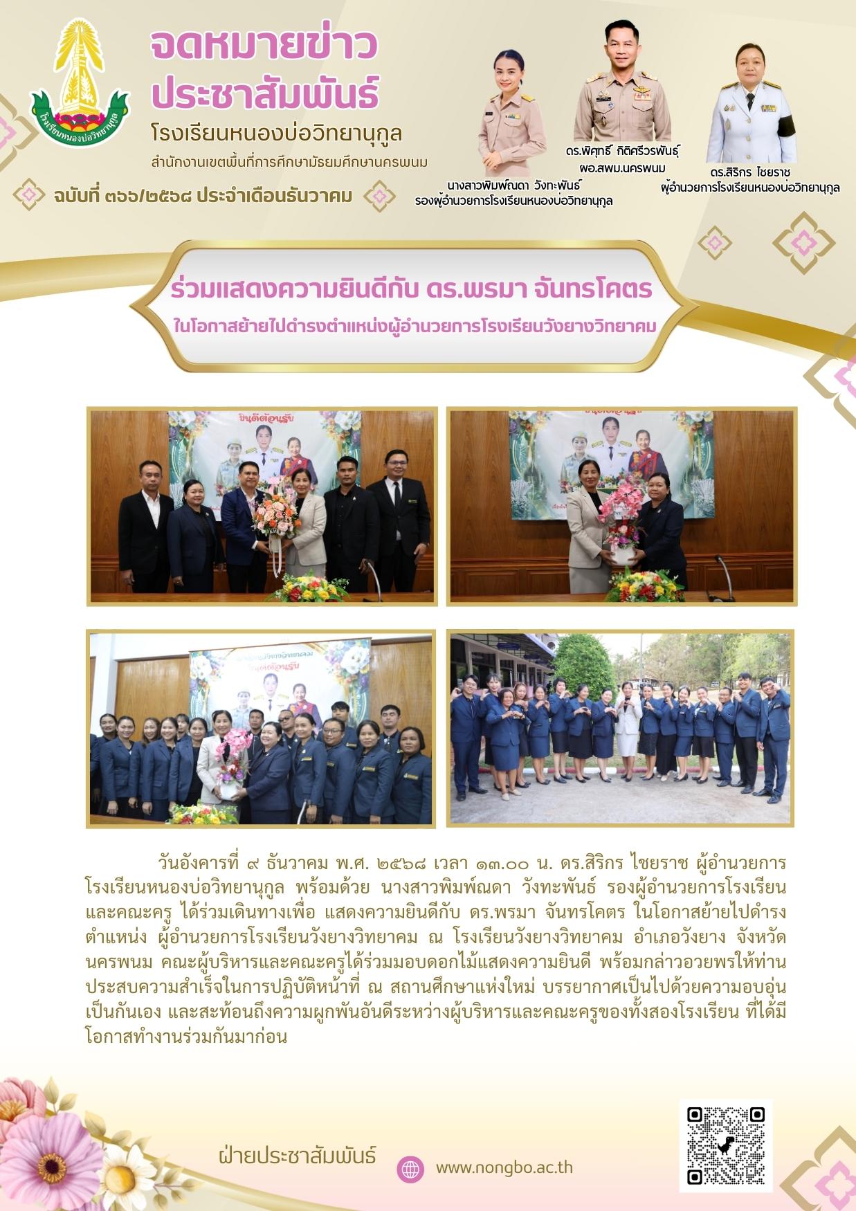 ร่วมแสดงความยินดีกับ ดร.พรมา จันทรโคตร ในโอกาสย้ายไปดำรงตำแหน่งผู้อำนวยการโรงเรียนวังยางวิทยาคม