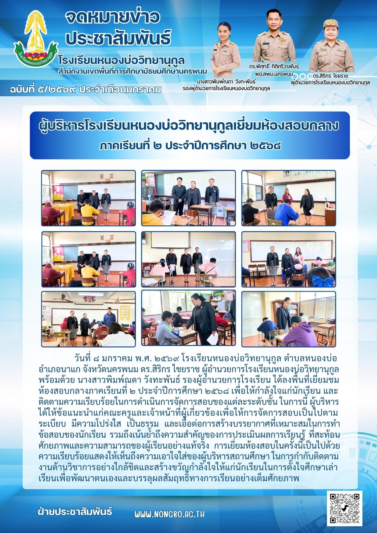 ผู้บริหารโรงเรียนหนองบ่อวิทยานุกูลเยี่ยมห้องสอบกลาง ภาคเรียนที่ ๒ ประจำปีการศึกษา ๒๕๖๘